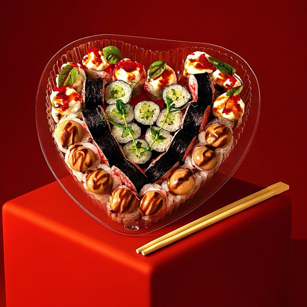 Акция к Дню всех влюбленных сет в коробке "сердце" со скидкой 20% до конца февраля. Сенсей с копченым лососем, икорный краб, бешеный цыпленок, мини огурец 32 шт