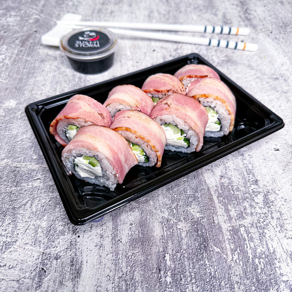 Рис, нори, сливочный сыр, свежий огурчик, зеленый лук, нежный бекон. 8 штук 260 г.